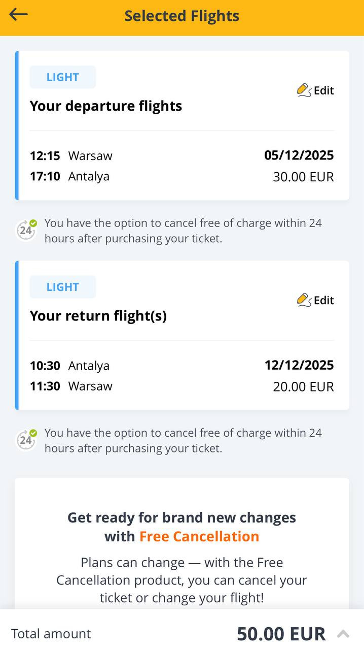 Пример бронирования Варшава-Анталья-Варшава за 50 евро туда-обратно: