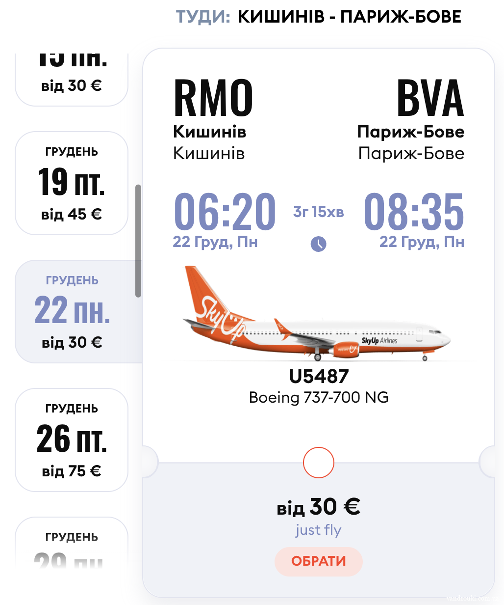 Пример бронирования билетов Кишинев — Париж-Бове в одну сторону за 30 евро: